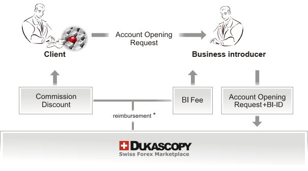 In this case, Dukascopy Bank will share 50% of its trading volume commissions with you for all clients you refer to it. This is your Introducer's remuneration.